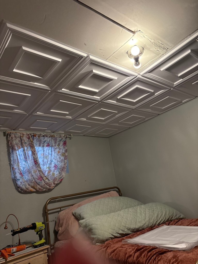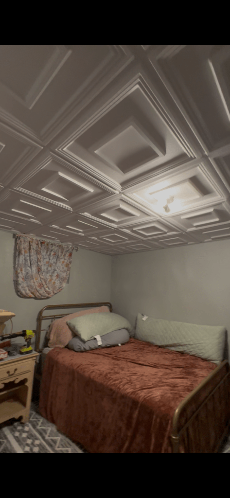 This project turned out beautiful. I honestly wouldn’t change anything because I’m still gonna have the insulation and soundproofing from the drywall but now I have a beautiful timeless looking ceiling that took me maybe a total of four hours to complete with some glue.